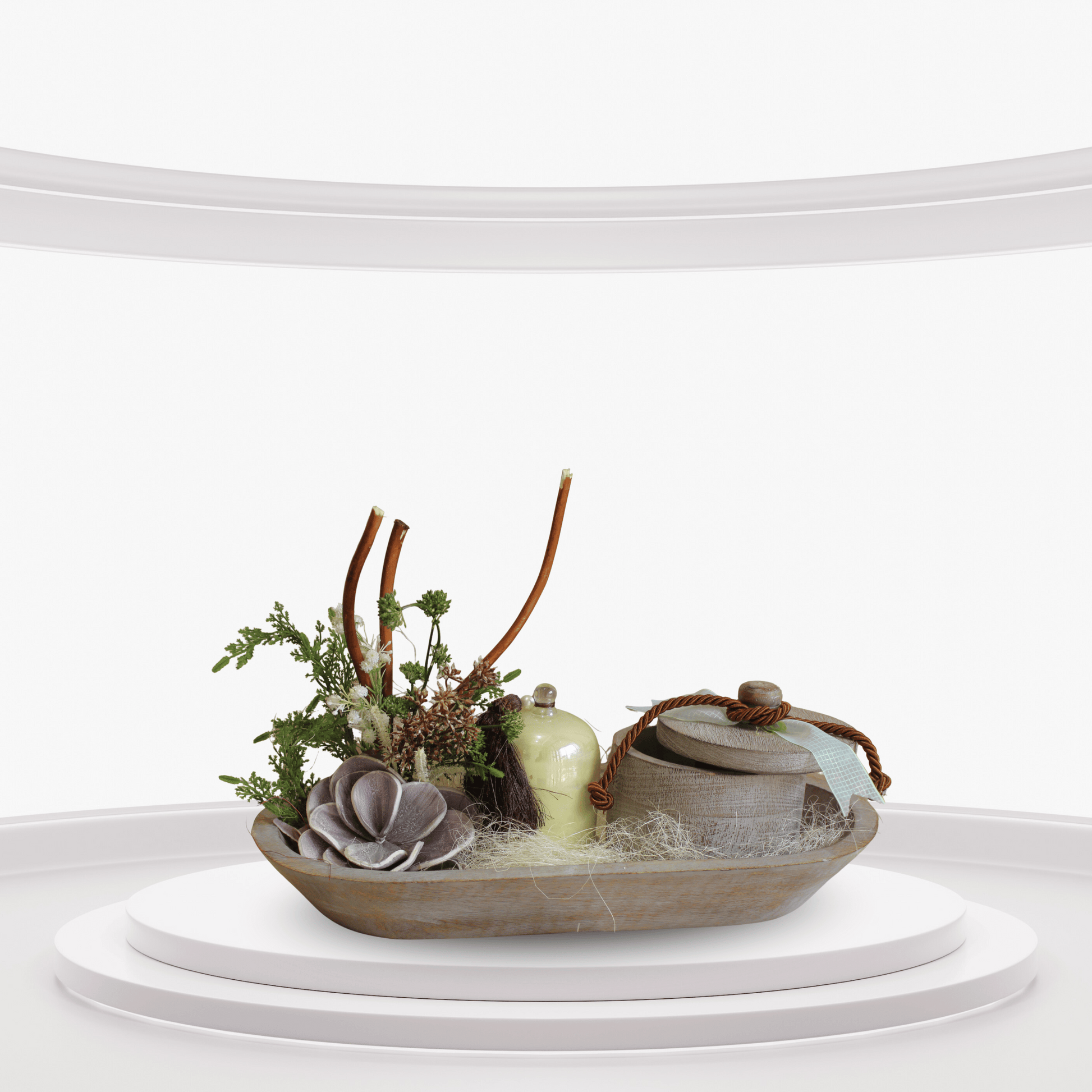 A nature-inspired home decor with earthy tones, handcrafted jars, and floral accents.